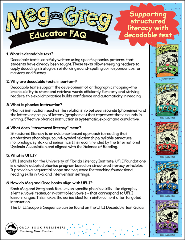 On this page, you will find a resource pack for each book in the Meg and Greg series. Each resource pack includes information for teachers and parents about the focal concepts in the book, the book’s activity pages and vocabulary word lists.